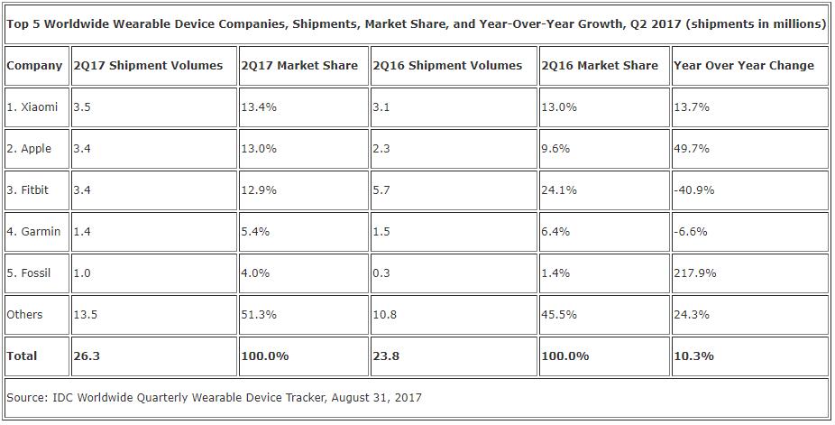 從IDC的數據來(lái)看,在榜單上位居前五名的各家公司在今年第二季度期間的可穿戴智能設備出貨量均超過(guò)了100萬(wàn)部,而三星似乎表現不佳,未進(jìn)入前五名行列。
