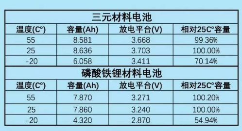 從上圖中能夠看出,以25℃為基準常溫,兩類(lèi)電池在55℃高溫下放電與常溫25℃下放電,放電容量幾乎沒(méi)有差別。但在零下20℃時(shí),三元鋰電池與磷酸鐵鋰電池相比有比較明顯的優(yōu)勢。