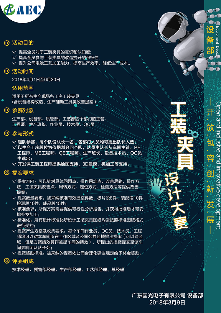 3月7日,由國光電子設備部主辦,工藝部協(xié)辦的首屆工裝夾具設計大賽于正式啟動(dòng)。國光電子鼓勵創(chuàng )新,本次活動(dòng)目的在于集思廣益,全員參與優(yōu)化所有生產(chǎn)現場(chǎng)各工序工裝夾具(含設備結構改造、生產(chǎn)輔助工具類(lèi)改善提案),從而提高全員對于工裝夾具的意識和認知度,提高全員參與工裝夾具的改造提升的積極性,全面提升公司的制程能力和工裝化水平,提高生產(chǎn)效率,降低生產(chǎn)成本。