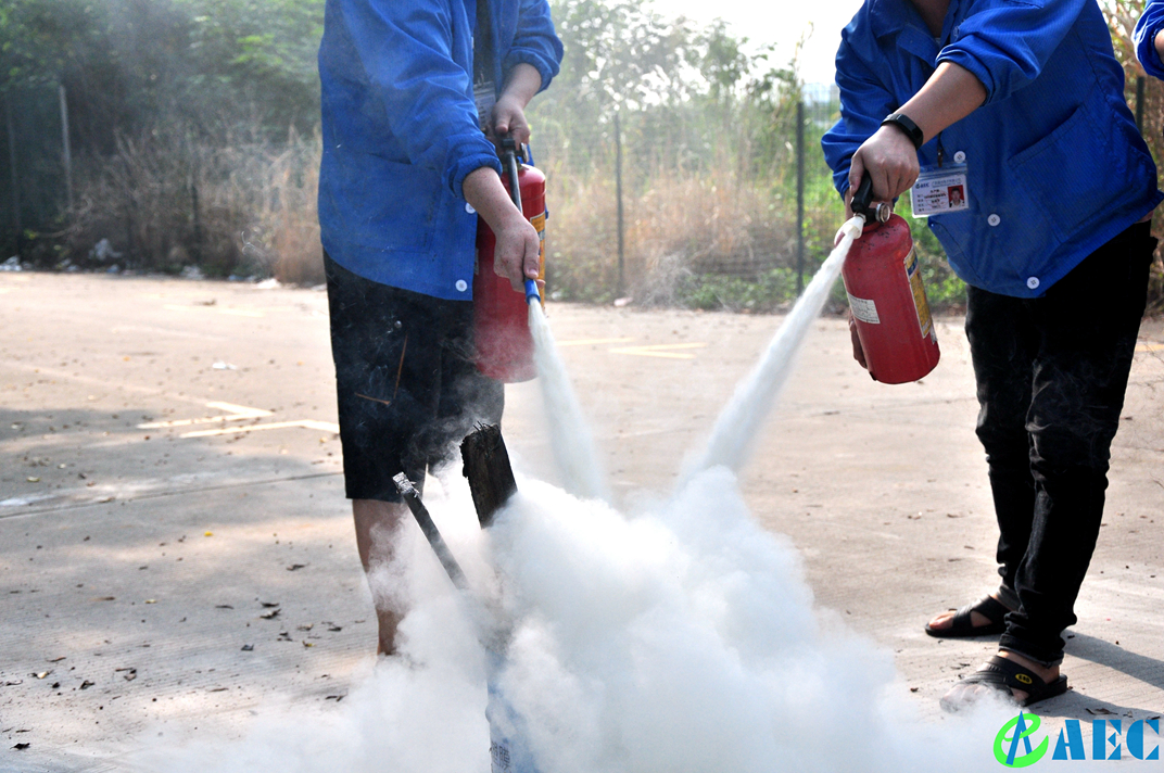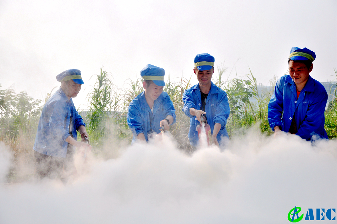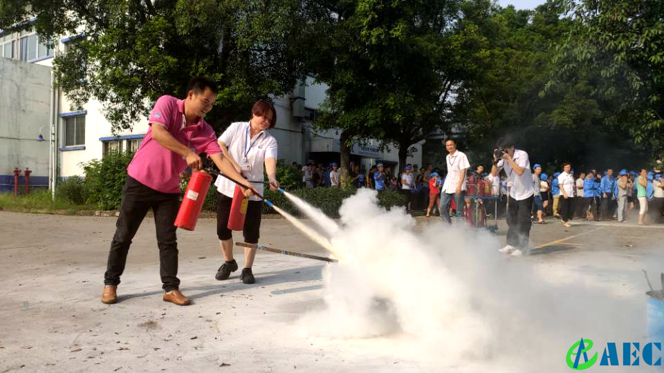 由滅火組-宋工講解滅火器的正確使用方法,并由滅火組成員進(jìn)行滅火器演示使用。