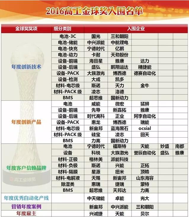 背景資料:高工鋰電是高工產(chǎn)研旗下專(zhuān)注于鋰電、動(dòng)力電池領(lǐng)域的集產(chǎn)業(yè)研究、平面媒體、專(zhuān)業(yè)網(wǎng)站、展覽會(huì )議于一體的全方位整合服務(wù)平臺,是企業(yè)成長(cháng)的最強最全面的合作伙伴。為鼓勵技術(shù)創(chuàng )新、品牌創(chuàng )新,記錄與回望一年以來(lái)中國鋰電池企業(yè)成長(cháng)歷程、行業(yè)重大變革力量,高工鋰電再次發(fā)起2016年度金球獎評選,本次評選以“尋找行業(yè)新動(dòng)力”為主題無(wú)疑成為行業(yè)一大盛事。