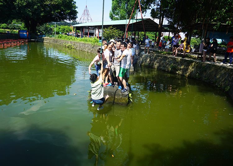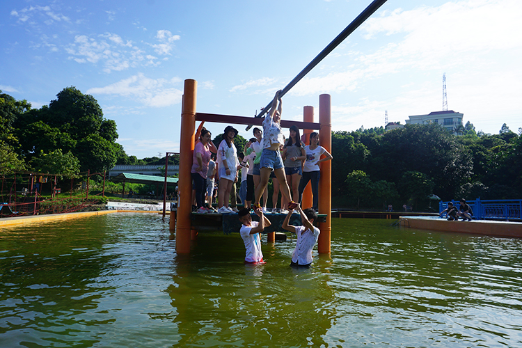 下午,我們需要參加的是緊張刺激的水上拓展訓練。其中一項活動(dòng)為“孤島求生”,隊員必須從岸邊的起點(diǎn),利用空中的長(cháng)繩擺蕩到水面上一個(gè)面積約1㎡的平臺上,全部成員順利登陸平臺再依次擺蕩回到岸邊起點(diǎn),平臺目前最高紀錄可同時(shí)站立26人。